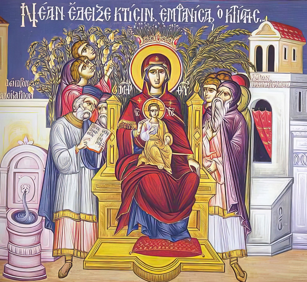 После славного вознесения Господа на небо Божия Матерь является как избранное солнце посреди святых Апостолов. «Все они, – читаем в книге Деяний святых Апостолов, – единодушно пребывали в молитве и молении, с некоторыми женами и Мариею, Материю Иисуса» (1, 14). Как видим, дееписатель выделяет Марию, только Ее из упомянутых жен называя по имени. Божия Матерь становиться тем средоточием, куда святые Апостолы шли и перед выступлением на проповедь и куда возвращались после благовестнических путешествий. У Нее они получали и благословение на свои апостольские труды и с Ней же делились пережитыми радостями и скорбями. У той, которая бережно слагала и сохранила в Своем сердце все совершавшееся в земной жизни Спасителя (Лк. 2, 19). Проповедники Евангелия получали и напоминание божественных заповедей, и подкрепление в подвиге, и утешение в скорби. Как сосуд, в котором находилось благоухающее миро, продолжает благоухать и после, так, и тем более, Соделавшаяся сосудом Божества, Умащенная благоуханием Божественной благодати приближает к людям Своим присутствием, молитвой благодатное и спасительное присутствие и действие Того, Кто некогда обитал в Ней телесно, а ныне и всегда обитает в Ней, пребывает в Ней, пребывает с Ней духовно.