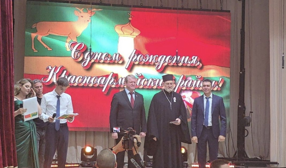 Одна из важных наград, вручаемых на торжестве, – «За содействие СВО». Медаль учреждена главой администрации Красноармейского района и вручается тем, кто не оставляет без помощи и внимания бойцов, находящихся в зоне специальной военной операции. Такой медали был удостоен благочинный 17-го Полтавского благочиннического округа протоиерей Сергий Рыбкин. По благословению отца Сергия и при его непосредственном участии приход Архангела Михаила х. Трудобеликовского помогает Донбассу, начиная с 2015 года. Российским бойцам за последние три года было собрано и передано большое количество гуманитарной помощи: медикаментов, личных вещей, продуктов питания, технических средств и т.д.