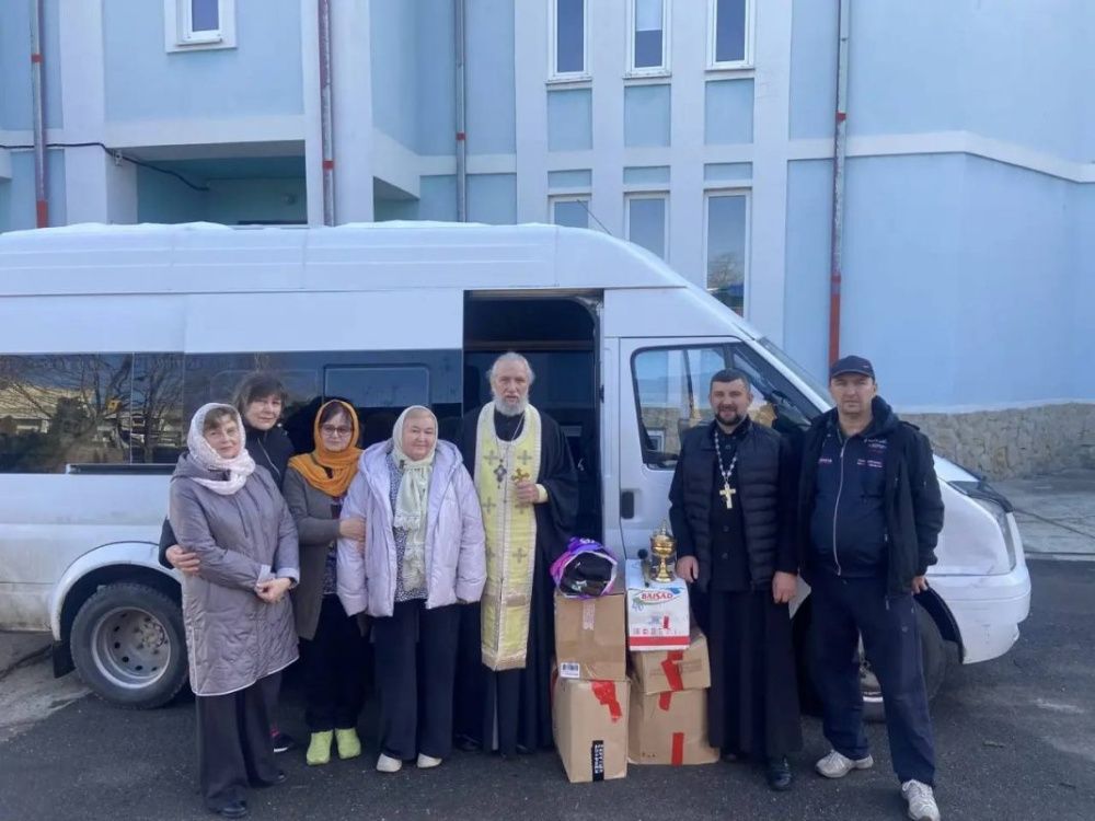 Настоятель Покровского храма протоиерей Геннадий Волков и штатный клирик храма иерей Андрей Овчинкин совершили чин освящения автомобиля, который доставит помощь до адресатов, окропили груз и волонтёров святой водой.