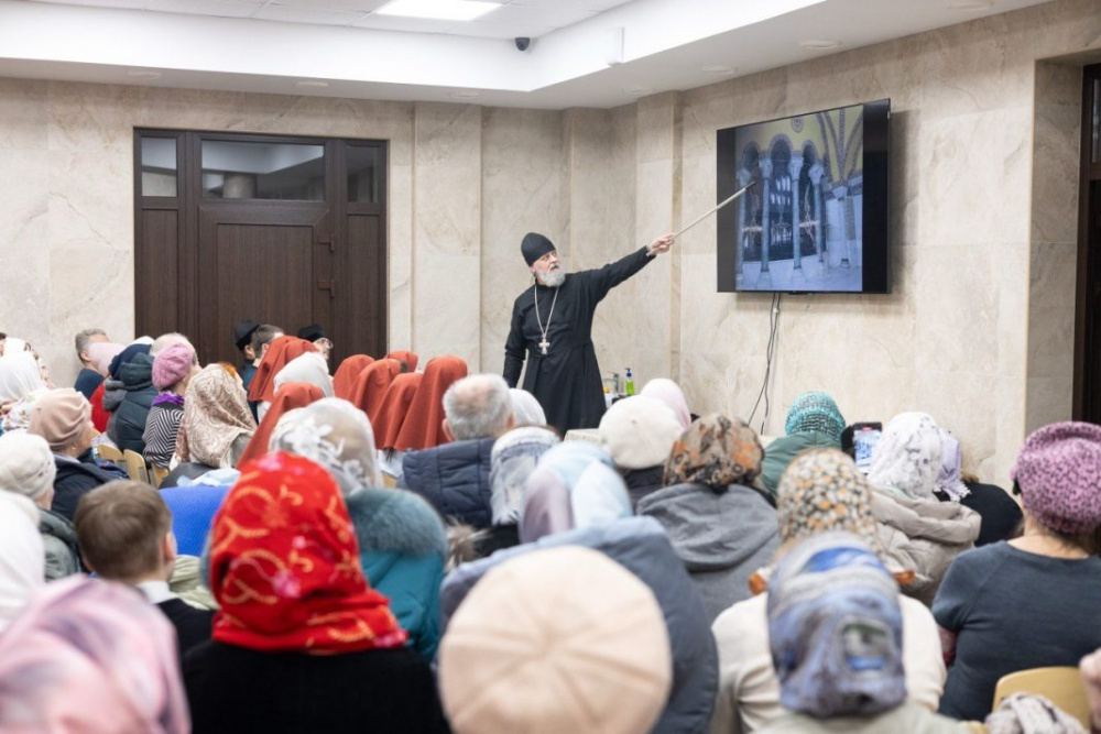 Участники встречи узнали о символическом смысле выбранных архитектурных решений, системе росписей и иконографии, которые создают целостный образ Небесного Царства и грядущего Второго пришествия Христа.