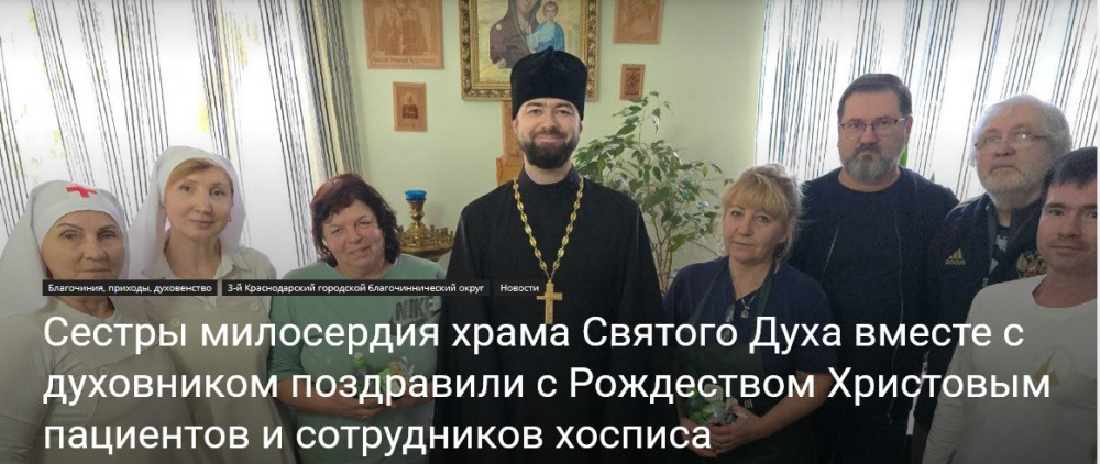 В период рождественских святок сестры милосердия храма Святого Духа вместе со своим духовником иереем Алексием Срынником посетили хоспис города Краснодара, чтобы поздравить сотрудников и пациентов с праздником Рождества Христова. Эта благотворительная акция стала уже доброй ежегодной традицией.