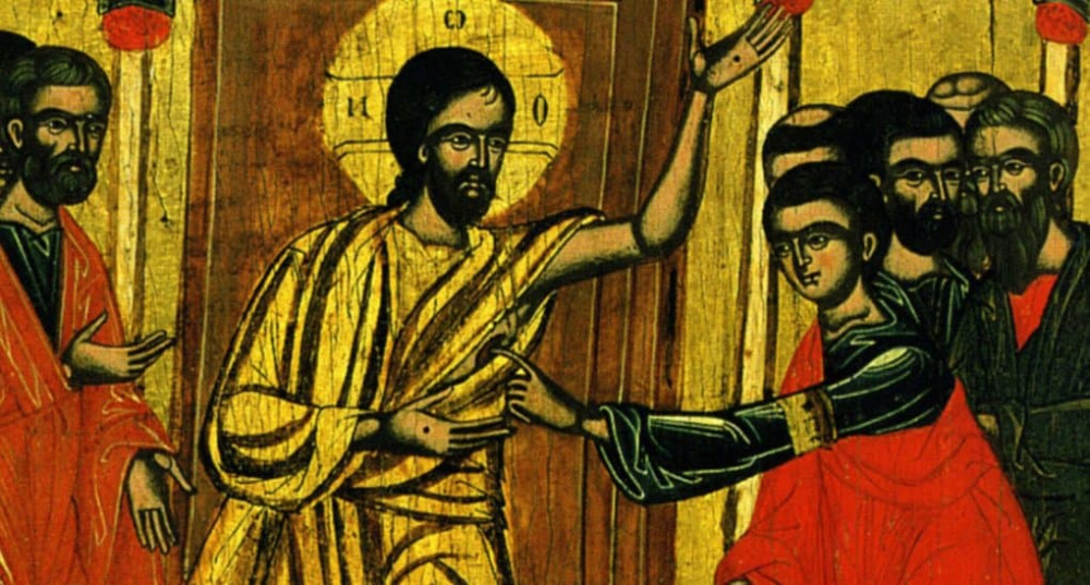 Фома же, один из Двенадцати, называемый Близнец, не был тут с ними, когда приходил Иисус. Другие ученики сказали ему: мы видели Господа. Но он сказал им: если не увижу на руках Его ран от гвоздей, и не вложу перста моего в раны от гвоздей, и не вложу руки моей в ребра Его, не поверю. После восьми дней опять были в доме ученики Его, и Фома с ними. Пришел Иисус, когда двери были заперты, стал посреди них и сказал: мир вам! Потом говорит Фоме: подай перст твой сюда и посмотри руки Мои; подай руку твою и вложи в ребра Мои; и не будь неверующим, но верующим. Фома сказал Ему в ответ: Господь мой и Бог мой! Иисус говорит ему: ты поверил, потому что увидел Меня; блаженны невидевшие и уверовавшие (Ин 20:24–29).
