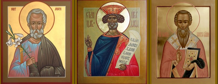 Я́ко Госпо́день учени́к, восприя́л еси́ пра́ведне, Ева́нгелие,/ я́ко му́ченик, и́маши е́же неопи́санное,/ дерзнове́ние я́ко бра́т Бо́жий,/ е́же моли́тися, я́ко иера́рх:// моли́ Христа́ Бо́га, спасти́ся душа́м на́шим.