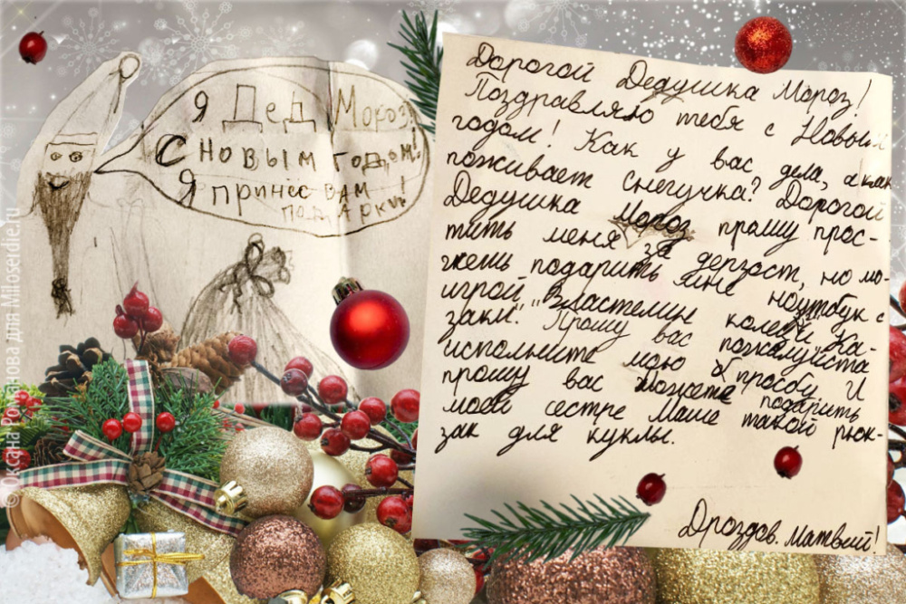 «Здравствуй дедушка Мороз. Трудно стало жить в этом мире. Многие из моих одноклассников не верят в тебя. Наверное это очень обидно когда в тебя не верят. Ну да ладно. Я-то в тебя верю. Пиши мне зимой, летом, весной и осенью!»
